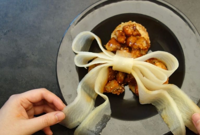 5. Put the prepared Korean fried chicken on top of the crispy rice bites, and garnish it with danmuji ribbons formed as a bow, and serve.
