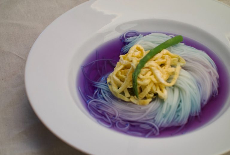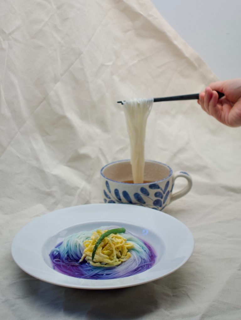 1. Strain the chilled sōmen and plate it in a deep dish with a few ice cubes and butterfly pea flower tea. Then, drizzle some lemon juice to create an ombre effect of blue and purple in the tea.